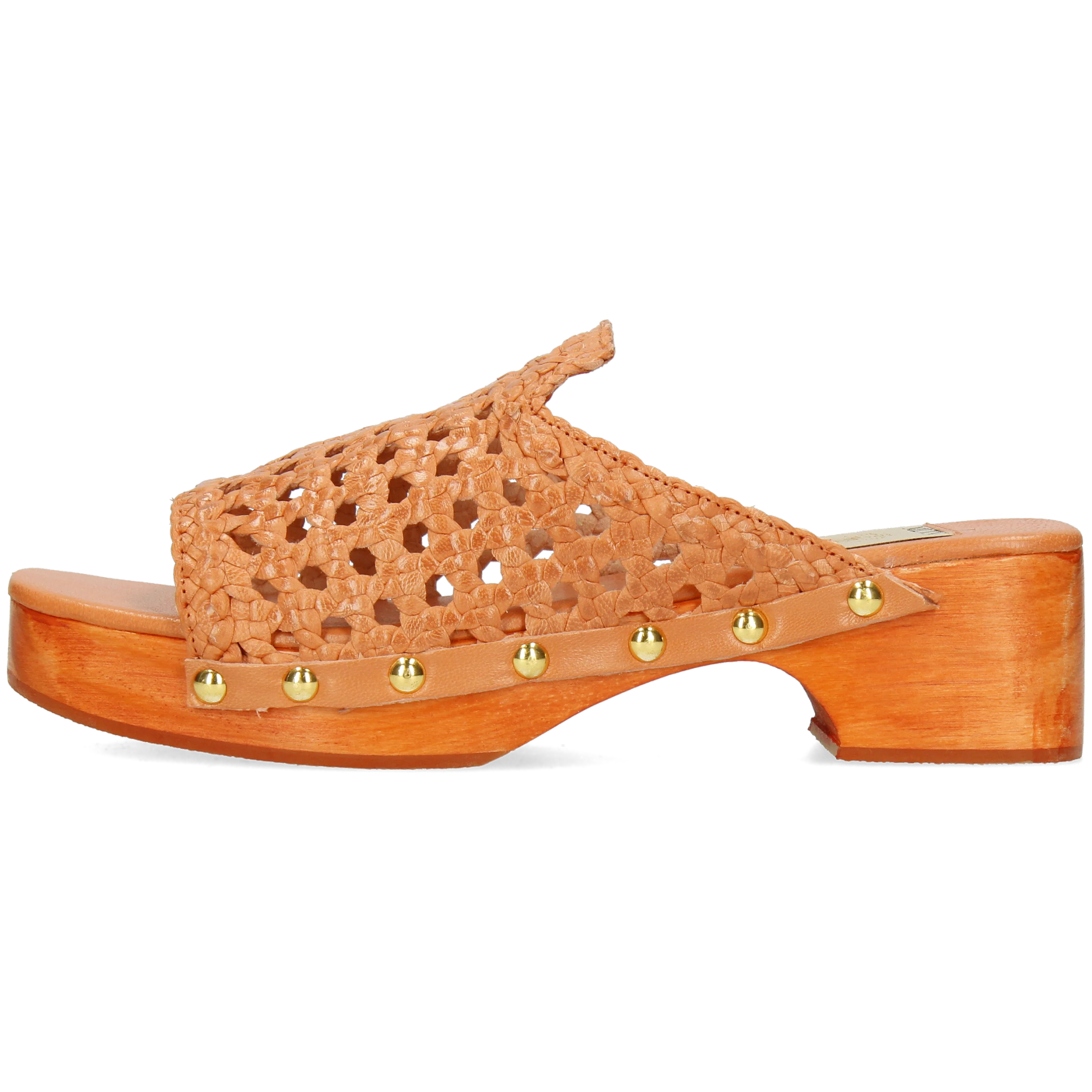 Melvin & Hamilton presents its spring-summer collection of clogs for women. Clog shoes with comfortable block heels will accompany you all season long. Discover our leather clogs Maria 1, its character and how to wear it. Our clogs are naturally made of high-quality leather and benefit from the brand's know-how. Available in different versions as feminine woven clogs or more grunge studded sandals, they are equipped with a platform sole made of wood and rubber, which gives them an elegant and chic look without compromising on comfort. Choose these orange leather clogs and show off your legs!